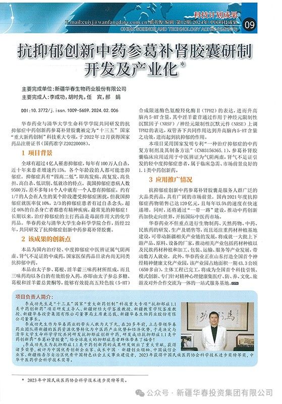 項(xiàng)目負(fù)責(zé)人李成功先生是“十三五”國家“重大新藥創(chuàng)制”科技重大專項(xiàng)“抗抑郁癥 1.1類中藥創(chuàng)新藥”項(xiàng)目研發(fā)主導(dǎo)人、新疆華春投資集團(tuán)有限公司董事局主席兼總裁、新疆華春生物藥業(yè)股份有限公司董事長。李成功先生作為華春藥業(yè)的帶頭人敢為天下先,在20多年前,立志帶領(lǐng)華春藥業(yè)團(tuán)隊(duì)將新疆的醫(yī)藥資源優(yōu)勢轉(zhuǎn)化為中醫(yī)藥產(chǎn)業(yè)優(yōu)勢和經(jīng)濟(jì)優(yōu)勢,于是決定與清華大學(xué)生命科學(xué)學(xué)院共同研發(fā)抗抑郁癥創(chuàng)新中藥,研發(fā)成功抗抑郁癥 1.1 類中藥創(chuàng)新藥“參葛補(bǔ)腎膠囊”,給全球龐大的抑郁癥患者群體帶來了福音!