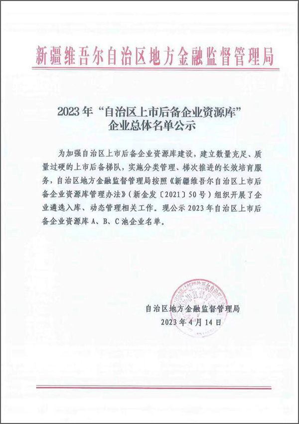 列入“自治區(qū)上市后備企業(yè)資源庫(kù)”的企業(yè),是自治區(qū)政府為加強(qiáng)自治區(qū)上市后備企業(yè)資源庫(kù)建設(shè)而建立的數(shù)量充足、質(zhì)量過(guò)硬的上市后備梯隊(duì)。自治區(qū)企業(yè)上市推進(jìn)工作領(lǐng)導(dǎo)小組辦公室按照《新疆維吾爾自治區(qū)上市后備企業(yè)資源庫(kù)管理辦法》進(jìn)行企業(yè)遴選入庫(kù)、動(dòng)態(tài)管理,對(duì)入選的企業(yè)實(shí)施分類管理、梯次推進(jìn)的長(zhǎng)效培育服務(wù),旨在深入發(fā)掘擬上市企業(yè)資源,優(yōu)化資源配置,加強(qiáng)多層次資本市場(chǎng)建設(shè),促進(jìn)自治區(qū)企業(yè)在多層次資本市場(chǎng)上市、掛牌和融資。