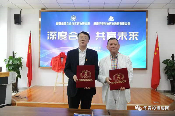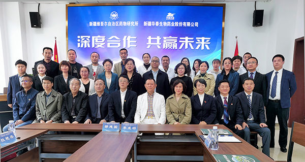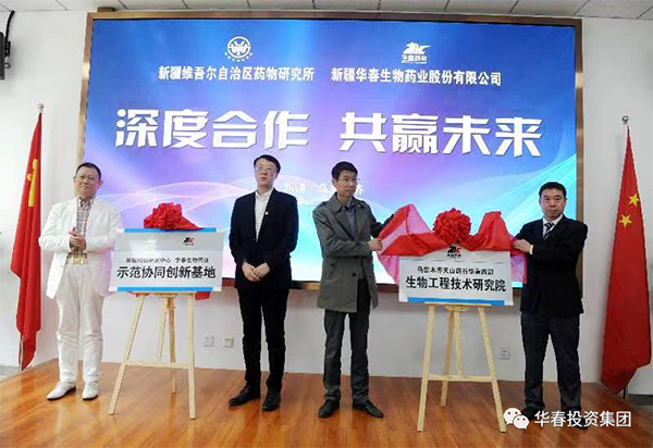 新疆華春生物藥業(yè)股份有限公司與自治區(qū)藥物研究所于4月 28日簽訂了深度合作協(xié)議,就雙方合作組建的新疆藥物研發(fā)中心華春生物藥業(yè)示范協(xié)同創(chuàng)新基地、烏魯木齊天山藥谷華春西部生物工程技術(shù)研究院舉行了揭牌。旨在更深層次多方面充分發(fā)揮雙方優(yōu)勢,強(qiáng)強(qiáng)聯(lián)合,實現(xiàn)共贏。華春投資集團(tuán)董事局李成功主席與自治區(qū)藥物研究所邢建國所長以及雙方的相關(guān)管理人員參加了簽約揭牌儀式。