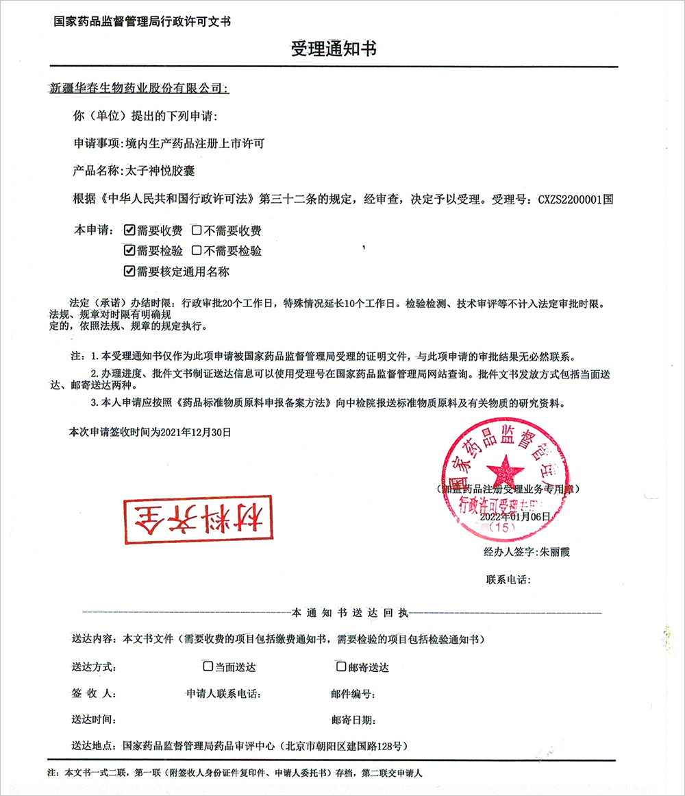 2022年1月7日,新疆華春生物藥業(yè)股份有限公司(以下簡稱“華春藥業(yè)”)收到國家藥品監(jiān)督管理局下發(fā)的《受理通知書》,由華春藥業(yè)提交的中藥創(chuàng)新藥 “太子神悅”膠囊新藥注冊上市許可申請已獲正式受理?,F(xiàn)就相關(guān)事項公告如下: